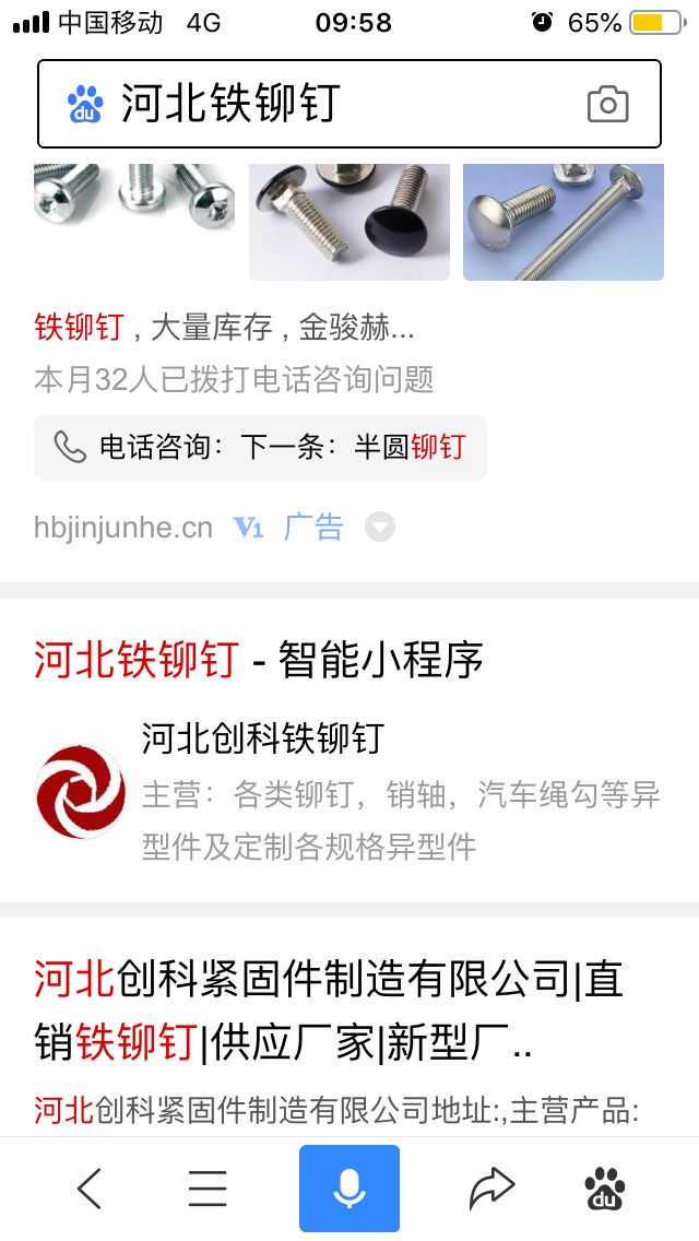 百度小程序:創(chuàng)科鉚釘、河北創(chuàng)科鐵鉚釘、河北創(chuàng)科銷(xiāo)軸、創(chuàng)科汽車(chē)?yán)K勾、創(chuàng)科靠背銷(xiāo)、創(chuàng)科減速帶釘、創(chuàng)科平頭鉚釘、創(chuàng)科開(kāi)口銷(xiāo)、創(chuàng)科異型銷(xiāo)軸