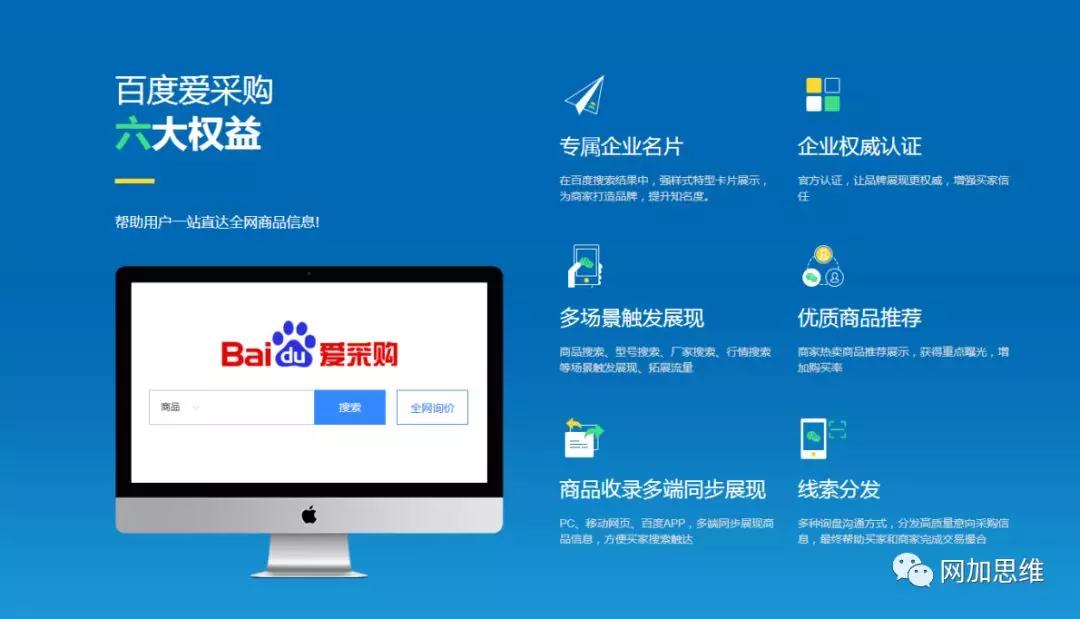 通過網加思維入駐愛采購的高級會員可以享受數據推送到百度愛采購平臺的機會,并可在百度搜索結果頁擁有專屬企業名片,企業信息和優質商品同步展現;并且獲得百度信譽認證,強化品牌認知,凸顯企業實力, 增強客戶信任度。實現PC 端、移動端、百度APP 多端展現,在為客戶做品牌宣傳的同時,強化產品曝光,提高成單機會。